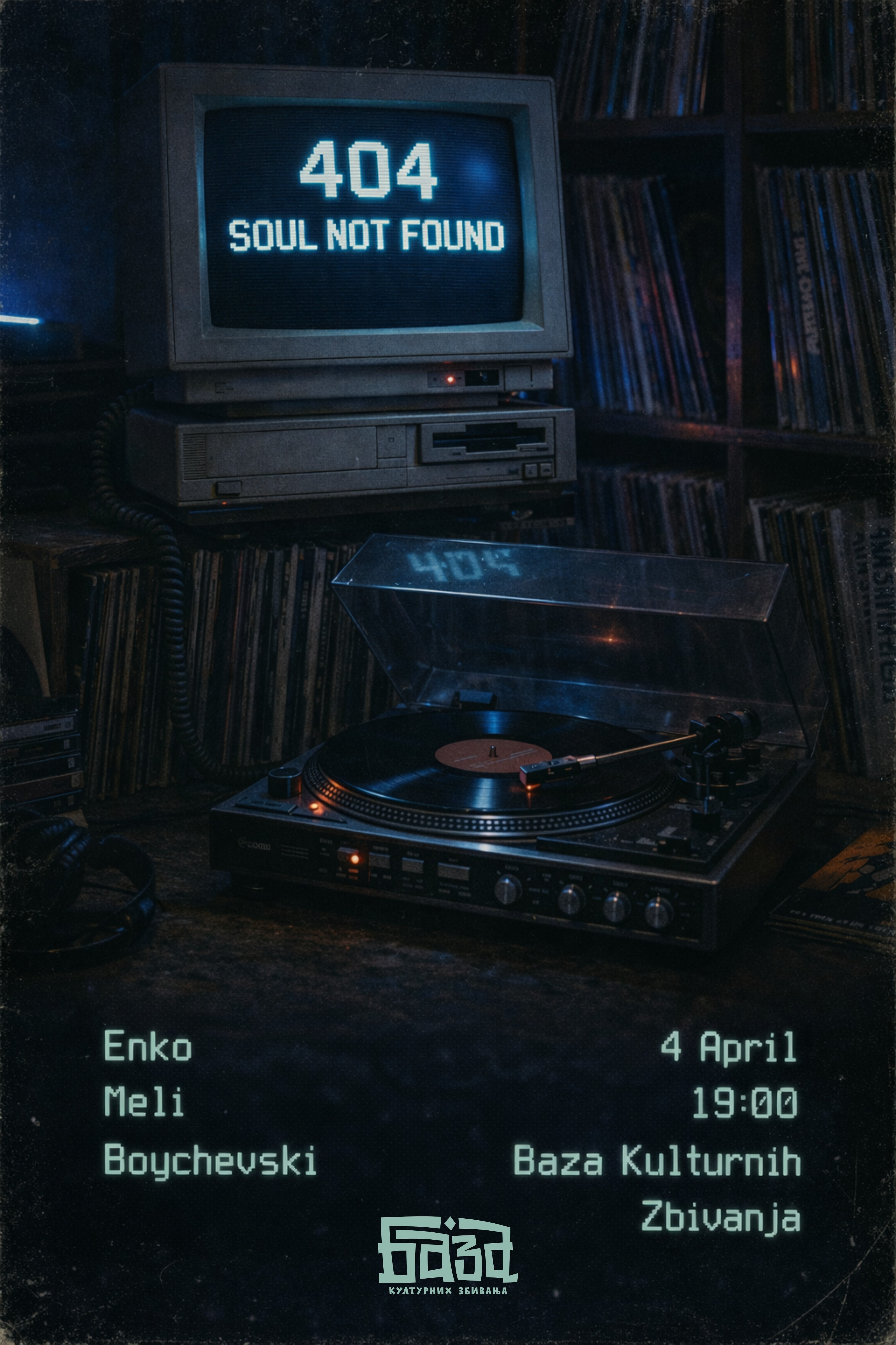 404 SOUL NOT FOUND Živimo u čudnom vremenu, sve se menja prebrzo: gradovi, ljudi, ritam života. Lako je izgubiti kontakt sa sobom i jedni s drugima. Možda i deo sebe. 04. aprila okupljamo se u Bazi. Samo vinil, pucketanje ploča, neočekivana otkrića naših DJ-eva i zvuk koji se ne krije iza algoritama. Tri DJ-a, svako sa svojom kolekcijom i raspoloženjem. Bez žurbe, bez preopterećenja, samo veče da udahneš, slušaš muziku i priče prijatelja, a možda i upoznaš nove srodne duše. *We may also expect Secret Guest. Or Gusar. Or Guset. Or all combined. 📍 Baza Kulturnih Zbivanja Venizelosova 34a, Dorćol 🎟️ Ulaz na donacije