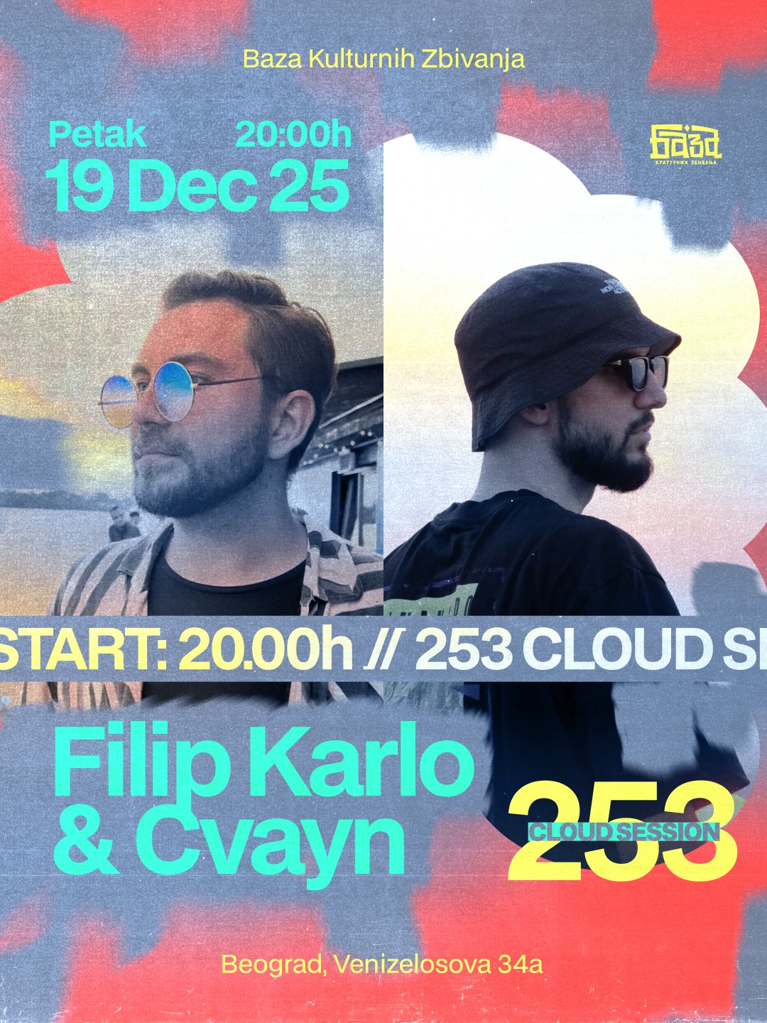 Cloud Session 253 - Filip Karlo & Cvayn U Bazu 19. decembra stiže tandem koji donosi drugačiji puls klupske scene. Filip Karlo - beogradski DJ i esteta poznat po eklektičnim setovima koji spajaju underground groove, house i elektronske slojeve sa urbanim senzibilitetom. Cvayn - predstavnik nove generacije techno artista, čiji groove i precizno građenje ritma podižu energiju i vode publiku u dublje sfere zvuka. Očekuje nas fluidno putovanje kroz house, tech i plesne dimenzije, uz dobru atmosferu! Vidimo se pod oblacima! ☁️☁️☁️☁️☁️