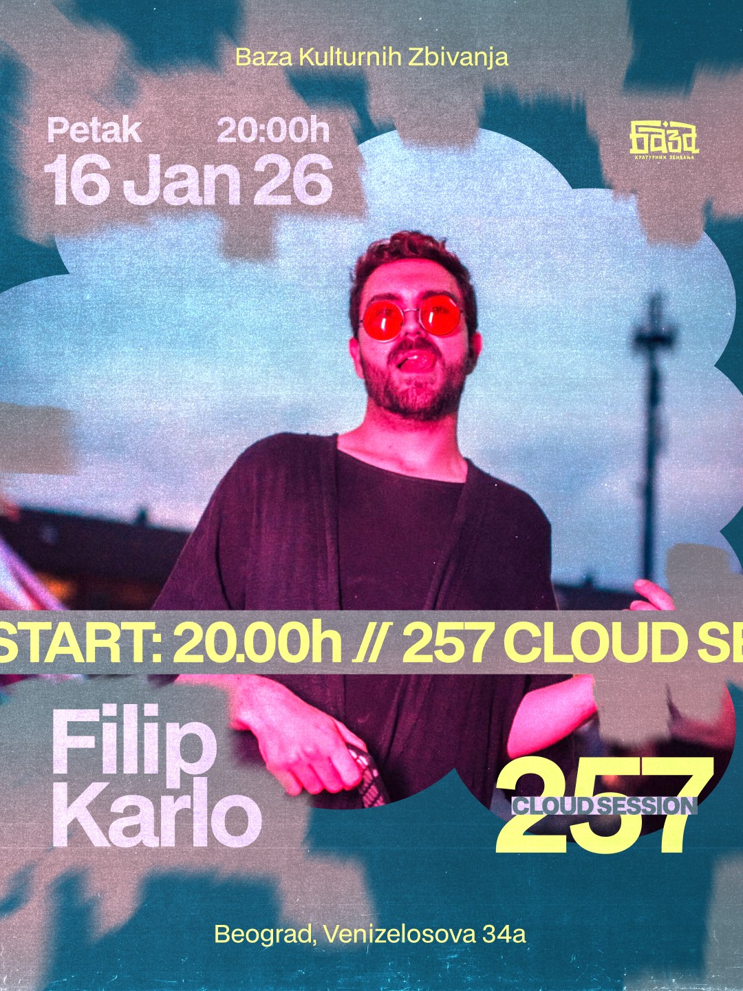 Cloud Session 257: Filip Karlo Filip Karlo se vraća u Bazu sa setom koji nosi prepoznatljiv underground puls i urbani senzibilitet. 🎧 Eklektična selekcija koja spaja groove, house i elektronske slojeve, vođena osećajem za prostor, trenutak i publiku. PET 16. JAN | 20h 🎟 Ulaz je na donacije