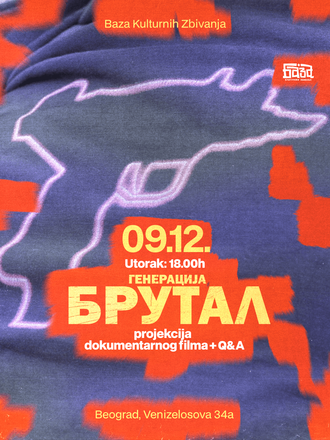 🎬 FILMSKA PREMIJERA U BAZI - “Generacija Brutal” 📅 Utorak, 9. decembar ⏰ Projekcije u 18:30 i 20:00 📍 Baza Kulturnih Zbivanja Dokumentarni film “Generacija Brutal”, master rad Nađe Đorđević u produkciji FDU, istražuje nastanak i razvoj jedne generacije kroz prizmu muzike, kulture i društvenih promena poslednje tri decenije. Kroz priču Vukašina Jasnića / Marlona Brutala - pratimo formiranje autentičnog rep podžanra, ali i društva koje ga je oblikovalo. 🎥 70 minuta dokumentarne nostalgije, društvene slike i muzike koja je promenila celu jednu ekipu. Nakon obe projekcije sledi Q&A sa rediteljkom i jednim od aktera filma - savršena prilika da čujete priče iza kamere. 🔗 Ulaz je slobodan / broj mesta ograničen Vidimo se u Bazi gde generacije ostavljaju trag.