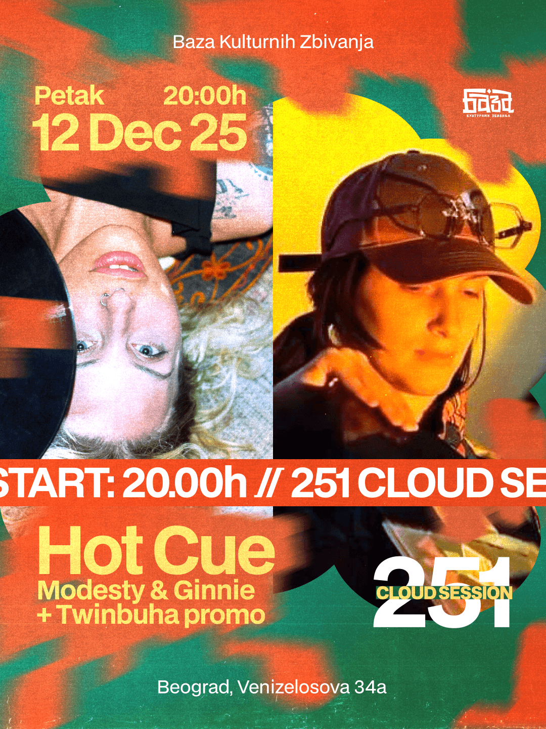 Anuška i Nevena vraćaju se u Bazu u b2b formatu nakon dužeg vremena, donoseći esenciju svog druženja i ljubavi prema istom ritmu i gruvu. Anuška aka Ginnie je DJ-ka čiji stil spaja tvrđe, bass-driven zvukove sa atmosferičnim, psihodeličnim i energičnim ritmovima. Njena selekcija kreće se kroz house, tech house, elektro, breakbeat i leftfield pravce, uz stalnu želju da kreira napet, dinamičan groove. Aktivna na beogradskoj i regionalnoj sceni, Ginnie donosi setove u kojima se prepliću sirovost, emocija i klupska energija koja drži podijum budnim do poslednjeg trenutka. Nevena aka Modesty je,kao aktivni član beogradske klupske scene, godinama pažljivog slušanja i upijanja različitih muzičkih pravaca uspela da kreira svoj jedinstveni stil u selekciji muzike i prezentuje ga publici nekih od najpoznatijih beogradskih klubova, kao što su Baza, Raft, 20/44 i Karmakoma. Njeni setovi su hipnotični, duboko ukorenjeni u underground house muzici, sa snažnim elementima electra, techna, a neretko i disco zvuka. U svojoj želji da često saradjuje sa talentovanim ženama, sredinom ove godine osniva ženski muzički kolektiv Hot Cue, čije su članice i Anuška Antić i Tijana Ristić. Tu je i Twinbuha, specijalno piće večeri, fuzija džina Twin Tigers i Drozli kombuhe, osvežavajući miks koji prati energiju žurke i daje joj dodatni obrt. Idealno za sve koji vole malo magije u čaši! Ovaj petak u Bazi biće posvećen energiji koja ne posustaje!