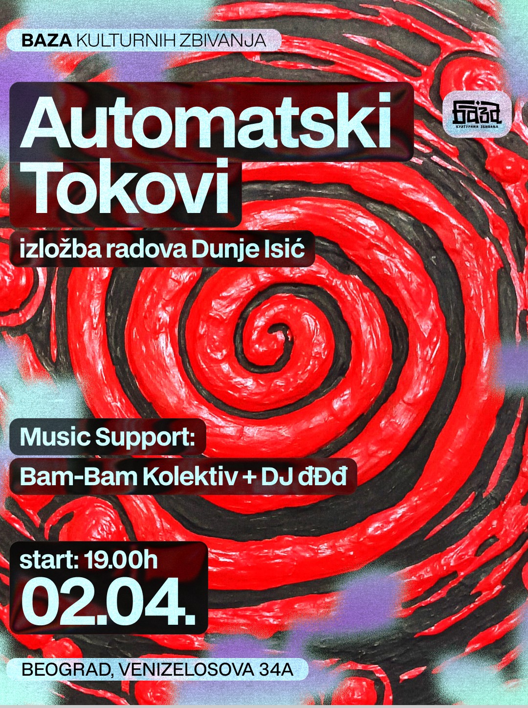 Dunja Isić kroz izložbu Automatski tokovi istražuje trenutak kada ruka preuzima kontrolu nad mislima. Radovi nastaju spontano, iz impulsa i intuicije bez unapred definisanog plana. Reljefi, crteži i slike povezuju se u jedinstven tok, beležeći unutrašnje procese i tragove neočekivanog. music support: Bam Bam Kolektiv 📍 Baza Kulturnih Zbivanja Venizelosova 34a, Dorćol 🎟️ Ulaz na donacije